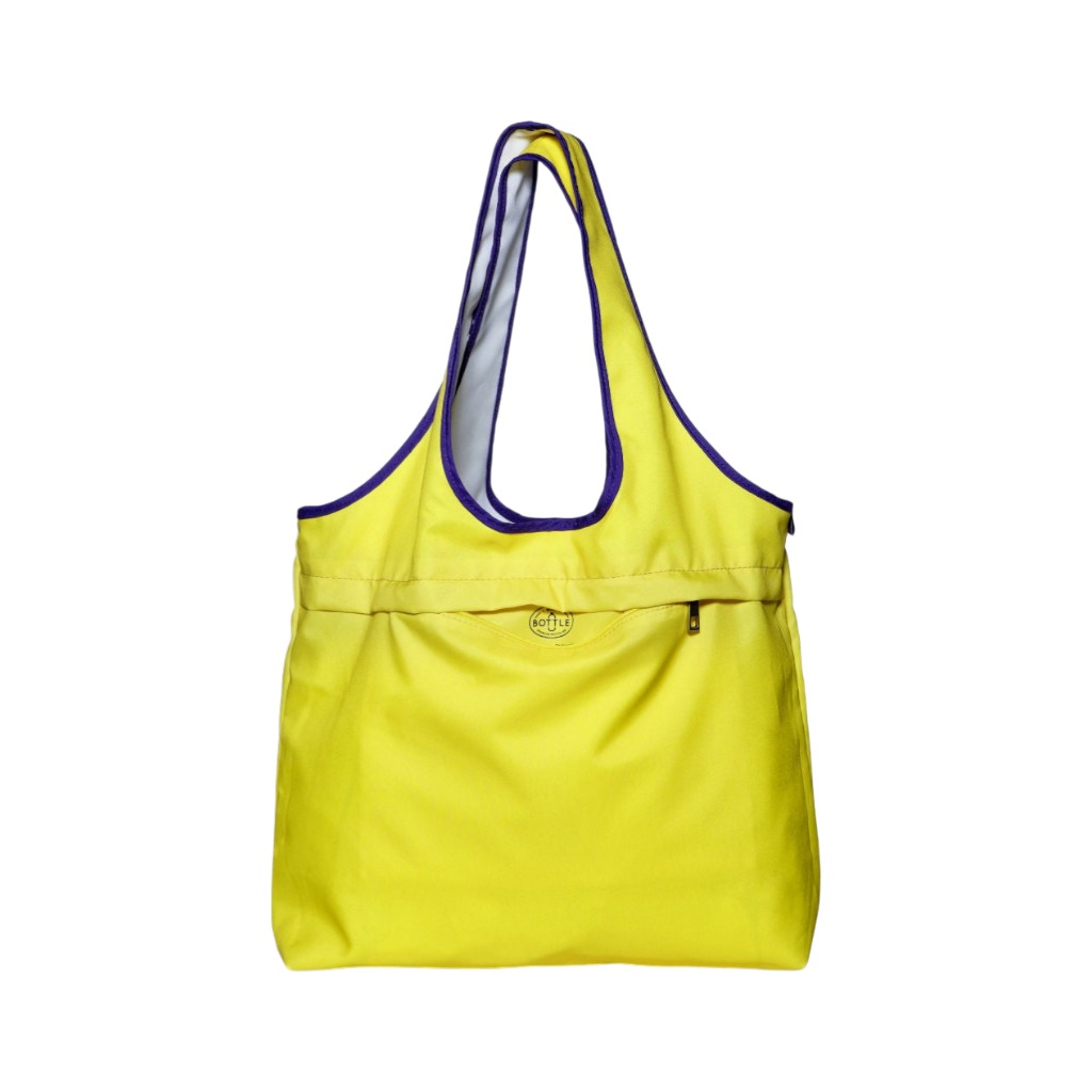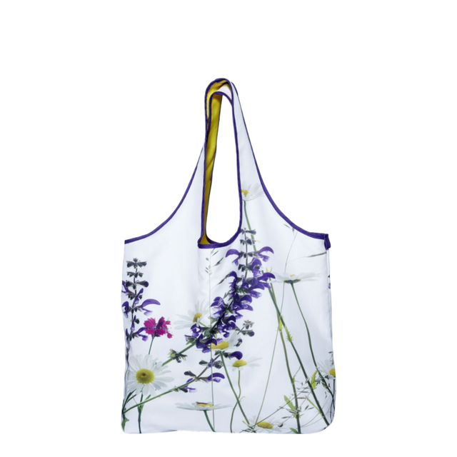 Diese Tasche ist aus einem Stoff, der zu 100% aus rezyklierten PET-Flaschen hergestellt wird. Diese werden nach der Reinigung geschreddert, eingeschmolzen und dann zu einem Garn gesponnen. Aus dem Garn wird anschliessend ein neuer Stoff gewoben, der strapazierfähig und waschbar ist.
