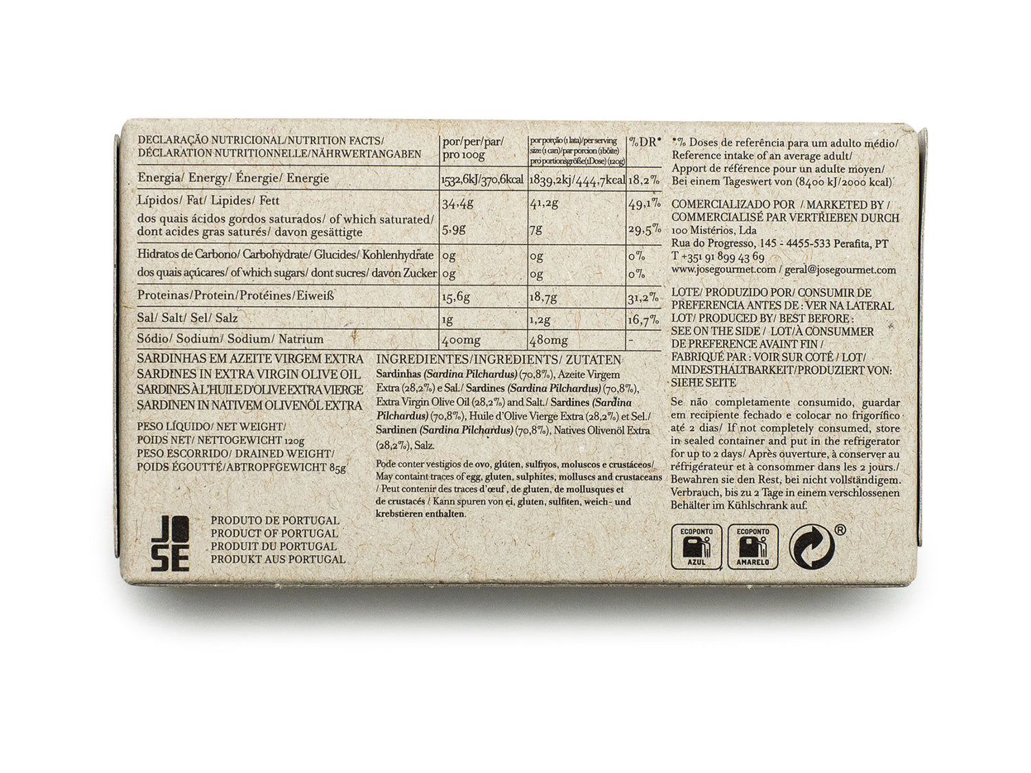 Eine Hommage an die mediterrane Tradition und den Geschmack der Sonne - Sardinen in Extra Virgin Olive Oil aus Portugal. Lass dich von der Reinheit dieser Sardinen verwöhnen und geniesse den Geschmack des Meeres und der Natur Portugals.