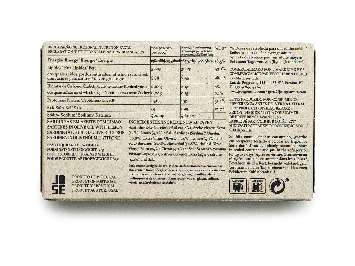 Jeder Biss ist ein Sprung in die Welt portugiesischer Frische und Lebensfreude. Die einzigartige Kreation von Jose Gourmet vereint zarte Sardinen mit belebendem Zitronenaroma und hochwertigem Olivenöl. Durch ihren reichen, vollmundigen Geschmack eignen sich die Sardinen besonders gut als Füllung für pikante Teigtaschen oder Empanadas zusammen mit Zwiebeln und Gewürzen.