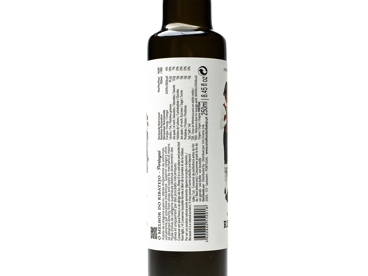 Das Ribatejo Extra Virgin Olivenöl aus reifen Oliven begeistert durch seinen fruchtigen Geschmack. Es fällt durch ein ausgewogenes Geschmacksprofil, einer leichten Würze und angenehmen Abgang auf. Das Olivenöl wird aus der Galgen Oliven herstellt und hat einen Säuregehalt von 0,2.