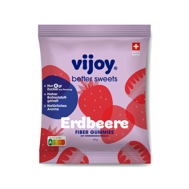 Die vijoy Fiber Gummies Erdbeere vereinen unwiderstehlichen Erdbeergeschmack mit dem Plus an Ballaststoffen (Fiber). Diese weichen, saftigen Fruchtgummis sind der perfekte Snack für alle, die naschen und gleichzeitig ihrer Verdauung etwas Gutes tun möchten.