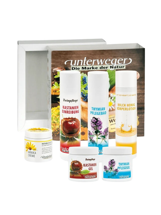 Unterweger Pflege Geschenkbox – Naturkosmetik-Set mit Kastanie, Arnika, Thymian & Honig zur Pflege von Muskeln & Haut