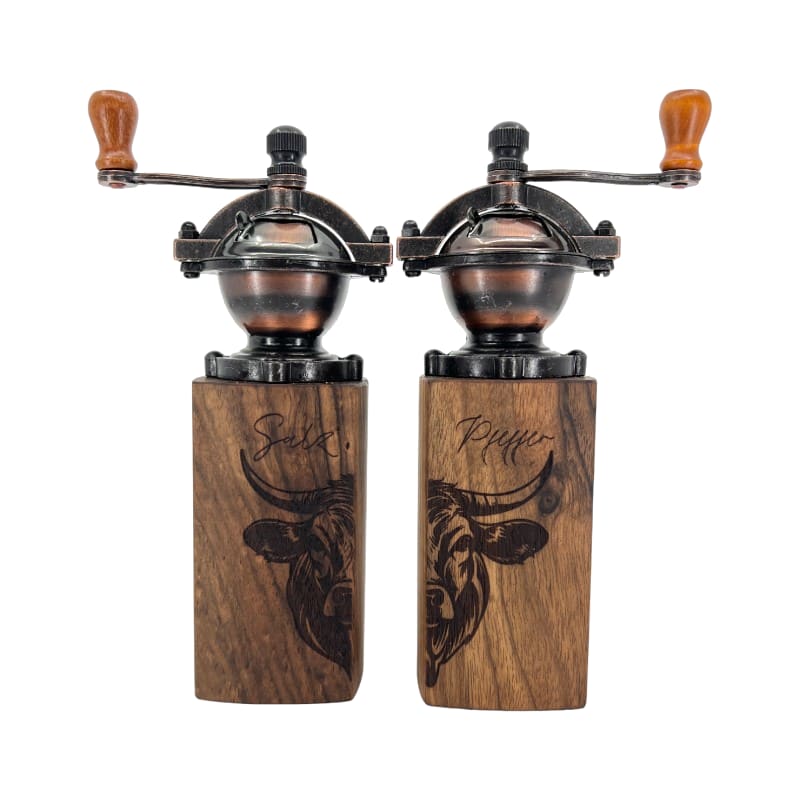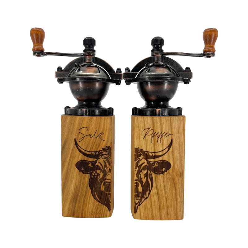Entdecke das HoizArt Gewürzmühlen-Set im Vintage-Stil mit Gravur "Kuh"! Diese handgefertigten Mühlen aus verschiedenen Holzarten vereinen rustikalen Charme und Funktionalität. Jede Mühle ist ein Unikat, ideal zum stilvollen Würzen deiner Gerichte. Ein perfektes Highlight für jede Küche und ein einzigartiges Geschenk!