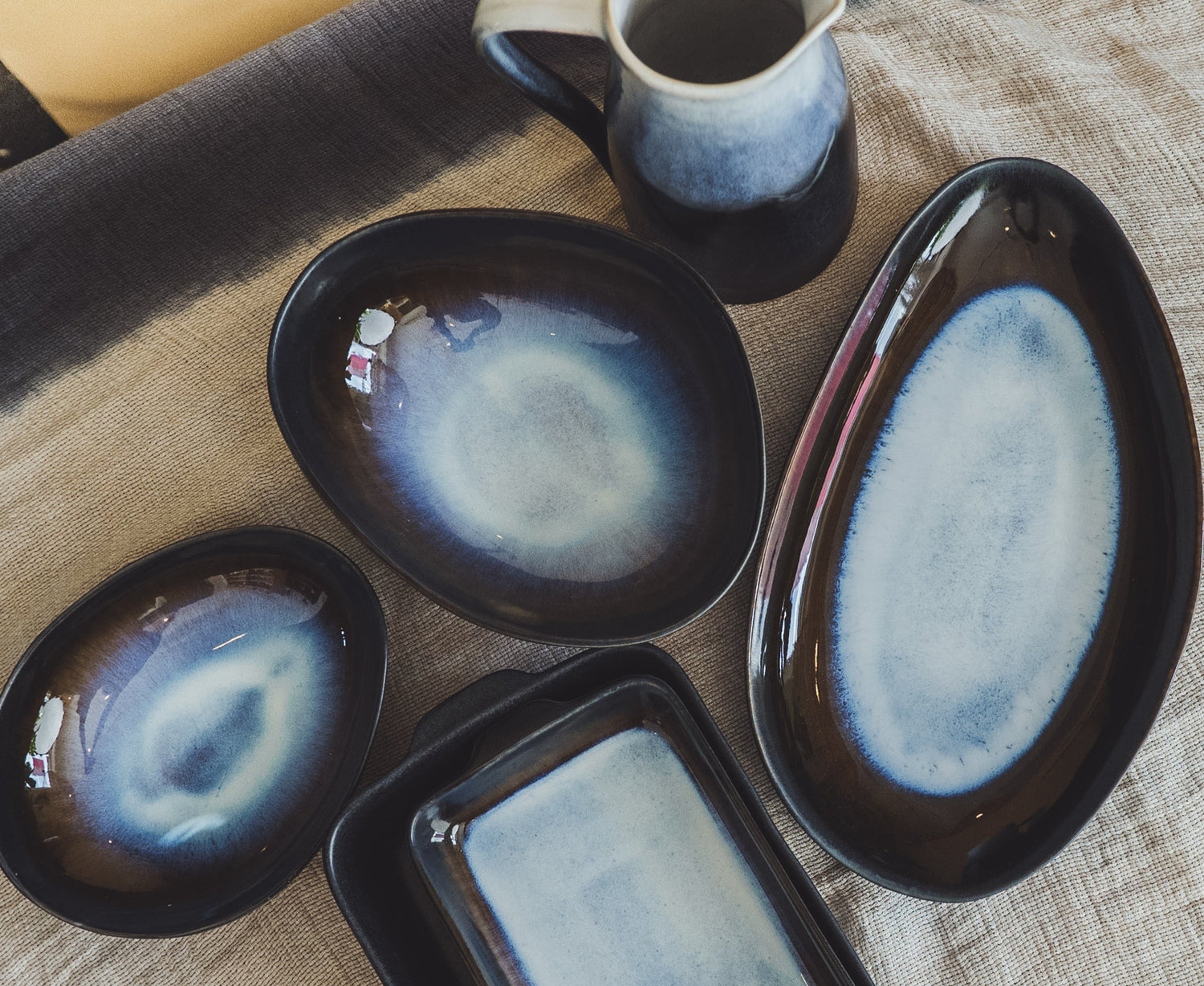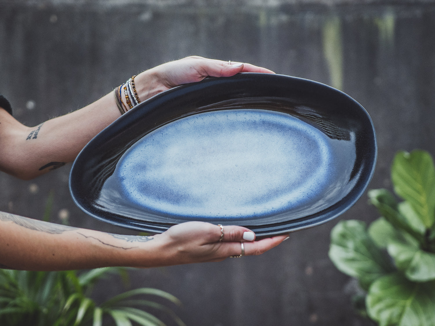 Jede Servierplatte hat einen einzigartigen Farbverlauf und erzählt ihre ganz eigene Geschichte. Die Profundezas Servierplatte ist ein wahres Kunstwerk mit ihrer eleganten dunkelblauen Farbe und den subtilen Verläufen, die an die Schönheit eines sternenklaren Nachthimmels erinnern. Jedes Exemplar wird durch den reaktiven Prozess einzigartig, wodurch sie eine faszinierende Tiefe und Textur erhält.