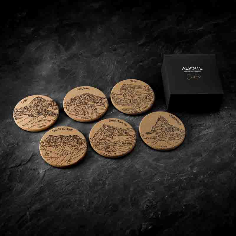 Das Set aus 6 hochwertigen Korkuntersetzern bietet die ideale Basis für Ihre Alpinte-Gläser. Die Untersetzer sind robust und dick, perfekt für den täglichen Gebrauch. Jeder Untersetzer ist mit präzisen Lasergravuren von Schweizer Wahrzeichen wie dem Matterhorn, der Jungfrau, der Dent Blanche, den Dents du Midi, dem Eiger und dem Titlis verziert. Diese Illustrationen wurden exklusiv von der Schweizer Künstlerin Corinne Weidmann für Alpinte entworfen. Geliefert werden die Untersetzer in einer ansprechenden Aufbewahrungsbox für eine praktische und stilvolle Aufbewahrung.