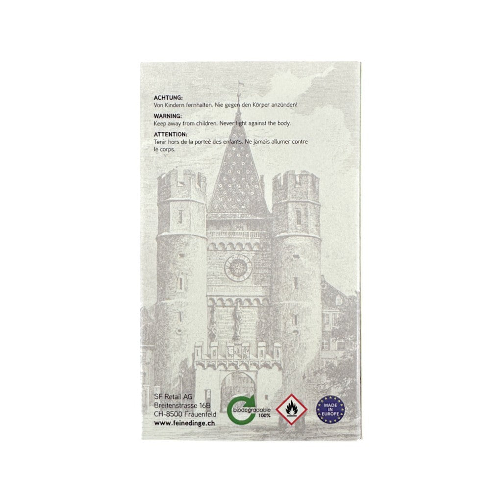 Das Spalentor – eines der schönsten Stadttore der Schweiz, ein Symbol für Geschichte, Handwerk und Basler Identität. Auf der mumix Streichholzschachtel erscheint es in feiner Illustration, reduziert und liebevoll gestaltet. Ob für Kerzen oder als kleines Mitbringsel: Diese Schachtel vereint Funktionalität mit Erinnerungswert – ein Alltagsbegleiter mit Sinn für das Schöne im Kleinen.