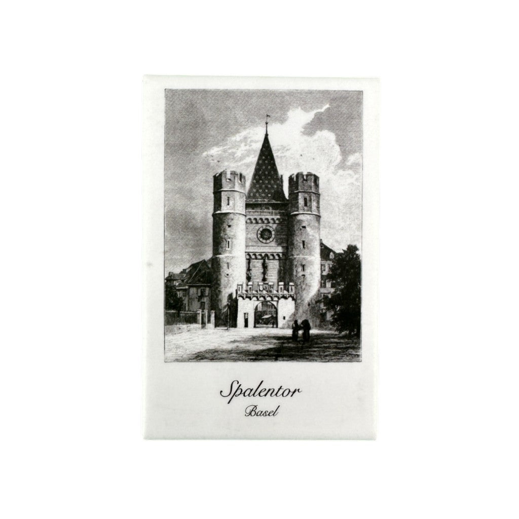 Der Magnet Nostalgie Spalentor zeigt eines der bedeutendsten mittelalterlichen Stadttore der Schweiz in einem liebevoll gestalteten Retro-Stil. Ein dekoratives Statement für alle, die Basel im Herzen tragen – ob zu Hause, im Büro oder als kleines Mitbringsel.