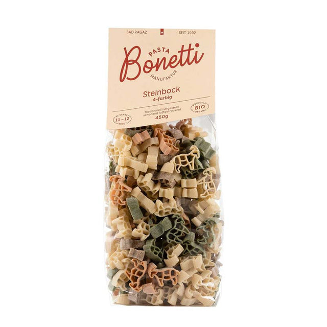 Entdecke die zauberhafte Bergwelt für deinen Teller mit den Bio Steinbock-Nudeln in 4 verschiedenen Farben - eine Hommage an die Schönheit der Alpen und die traditionelle Handwerkskunst der Pastaherstellung!