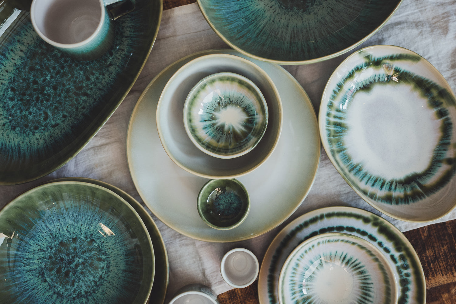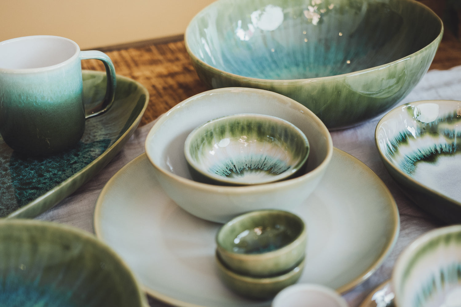 Der Aguarela Verde Teller begeistert mit zarten Farbverläufen in Pastellgrün, Weiss und Blau – inspiriert von Sonnenaufgängen und den sanften Reflexionen des Wassers. Mit einem Durchmesser von 26 cm bietet er ausreichend Platz für Hauptgerichte und lässt sich auch wunderbar als Unterteller für Schalen oder Frühstücksteller verwenden. Elegant, vielseitig und von der Natur Portugals inspiriert.