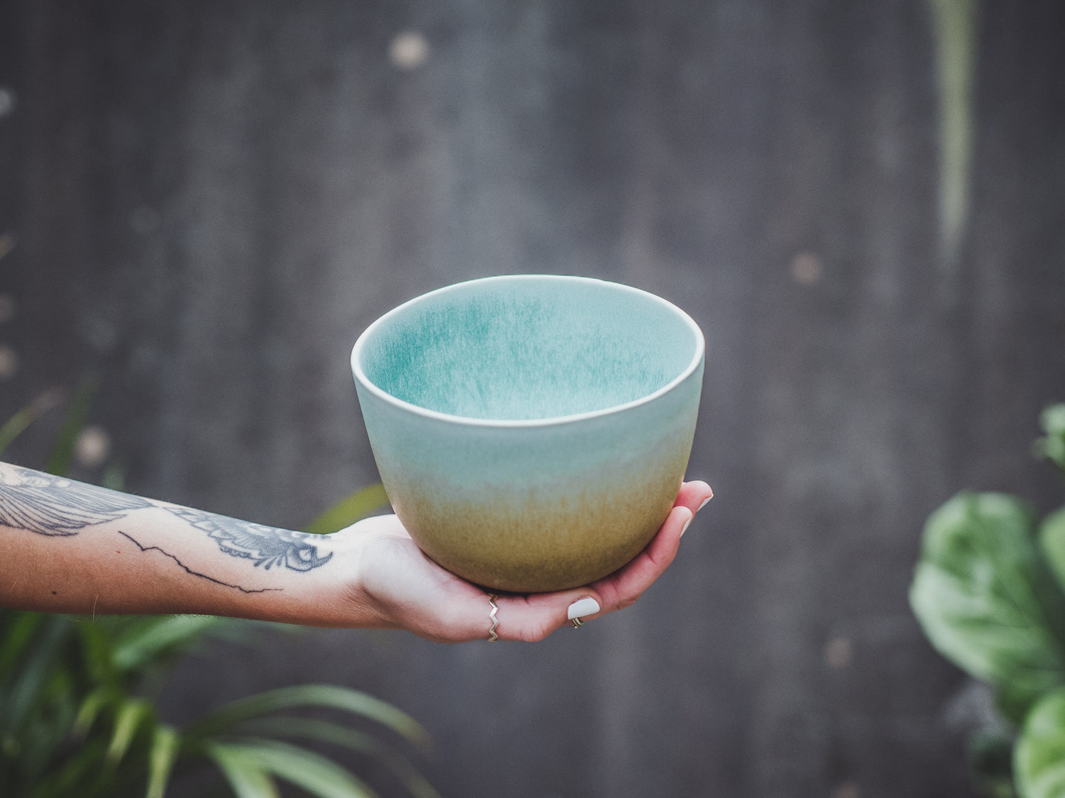 Die Menta Suppenschale besticht durch ihre vielseitige Grösse – ideal für Nudelsuppen, wärmende Vorspeisen oder bunte Salatkreationen. Sie liegt zwischen Müslischale und Salatschüssel und bietet damit genau das richtige Volumen für genussvolle Gerichte. Die seidenmatte Oberfläche fühlt sich angenehm in der Hand an, während der grün-braune Farbverlauf für natürliche Frische und mediterrane Leichtigkeit am Tisch sorgt. Vielseitig einsetzbar, handgefertigt und stilvoll in jedem Moment.