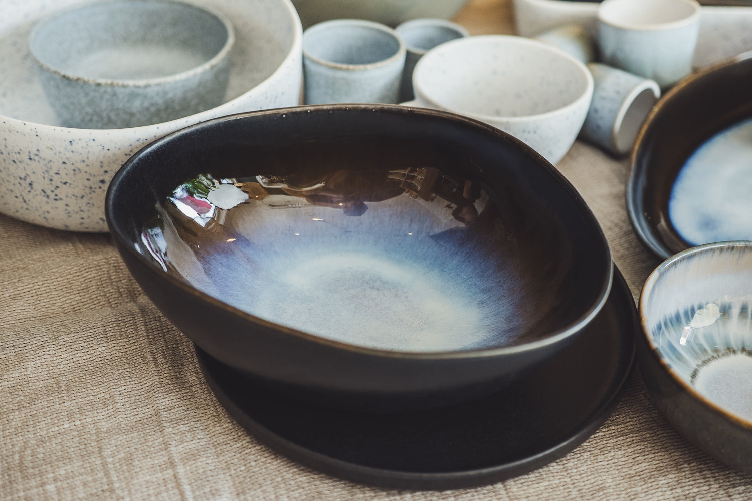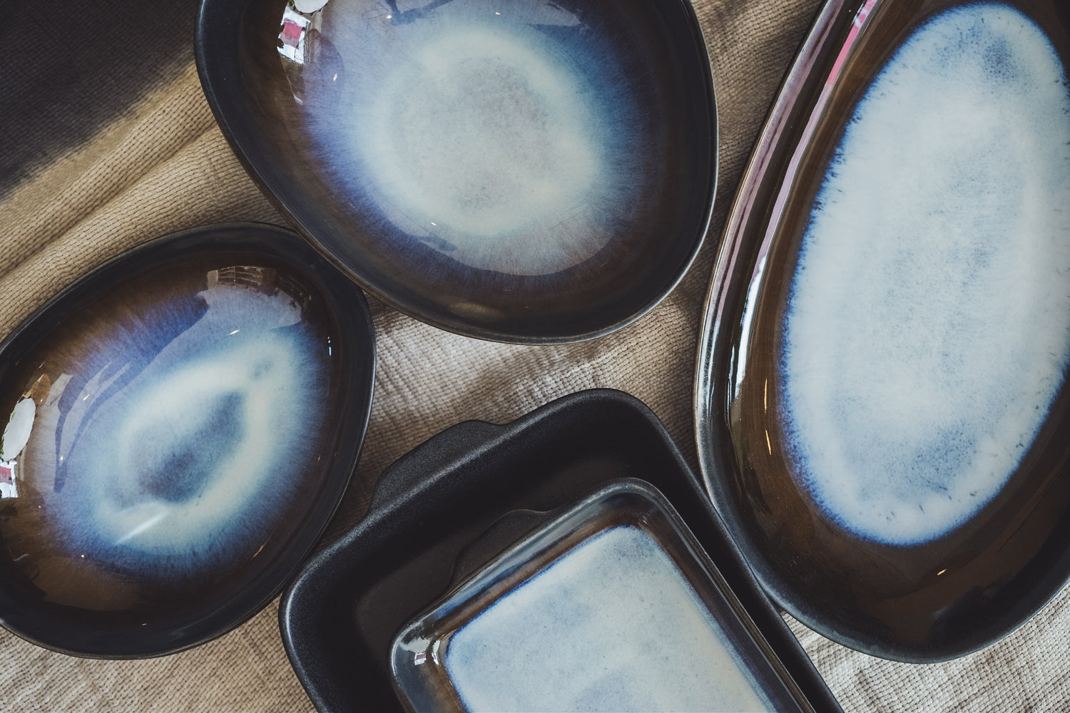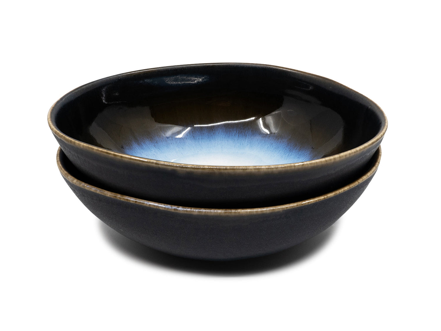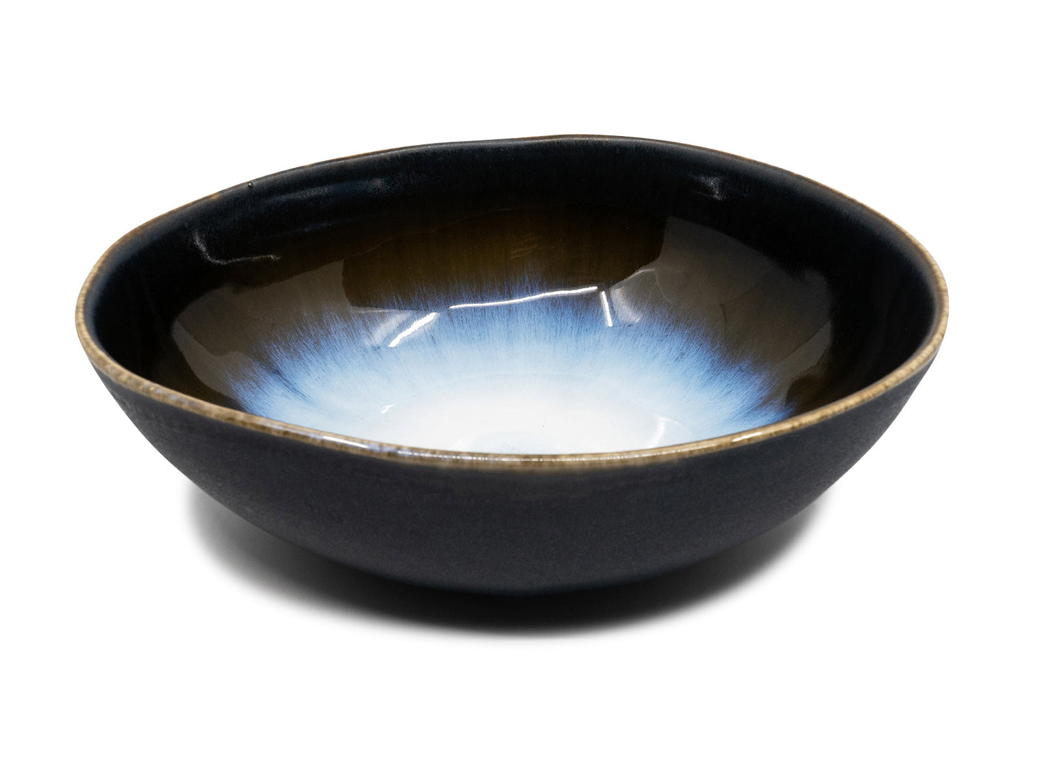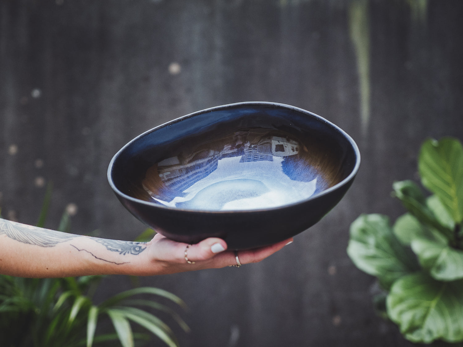 Erlebe die Magie der grossen Profundezas Schale in einem elegantem Dunkelblau. Der dunkelblau-weissliche Verlauf verleiht deinem Tisch eine edle Note und erinnert an einen klaren Nachthimmel. Jedes Exemplar wird durch den reaktiven Prozess einzigartig, wodurch sie eine faszinierende Tiefe und Textur erhält.
