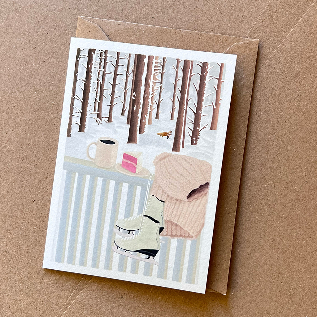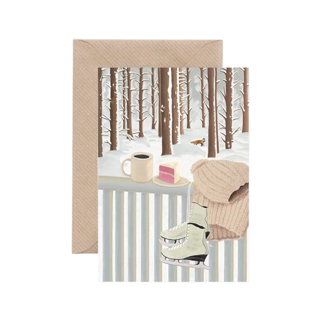 Diese einzigartige Weihnachtskarte zeigt einen verschneiten Balkon, auf dem die winterliche Stille mit einer dampfenden Tasse Tee oder Kaffee genossen werden kann. In der Ferne sorgt ein neugieriger Fuchs für eine verspielte Note. Eine stimmungsvolle Illustration, um warme Wintergrüsse zu verschicken und die festliche Jahreszeit mit Familie und Freunden zu feiern.