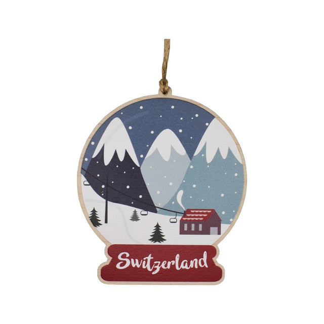 Der weihnachtliche Holzanhänger zeigt eine detailreiche Illustration eines Skilifts in einer Schneekugel. Eine charmante Dekoration für den Weihnachtsbaum, ein liebevolles Souvenir und das perfekte Geschenk für alle, die die Schweiz und ihre Winterwelt lieben.