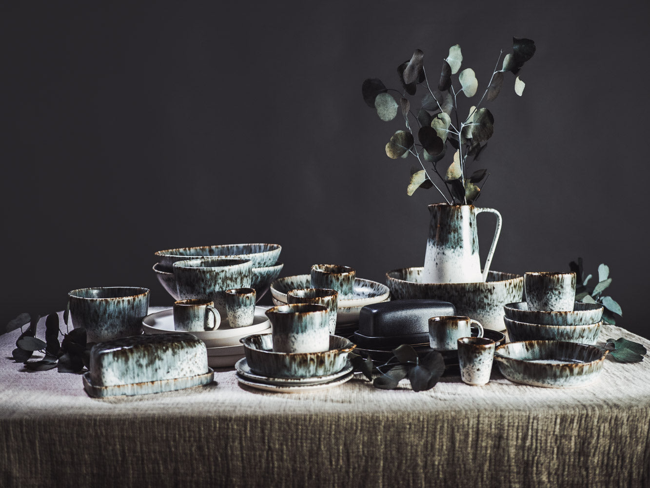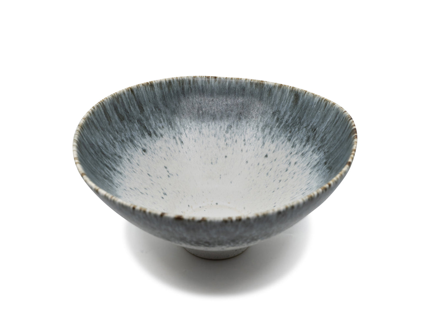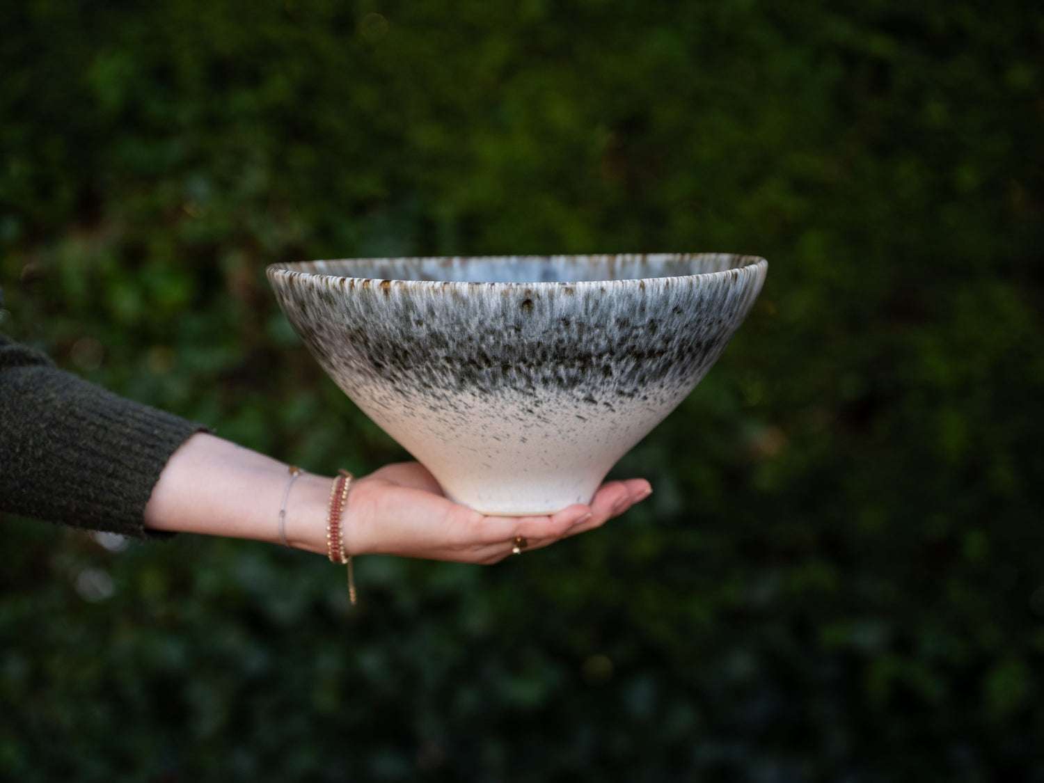 Vielseitige Schale mit besonderer Form und grau-weiss gesprenkeltem Muster. Ideal für Salate, Obst oder als besondere Präsentationsschale für Beilagen. Die dezente Farbgebung erinnert an Lichtreflexe bei Sonnenuntergang und verleiht der Schale eine zeitlose, elegante Ausstrahlung.