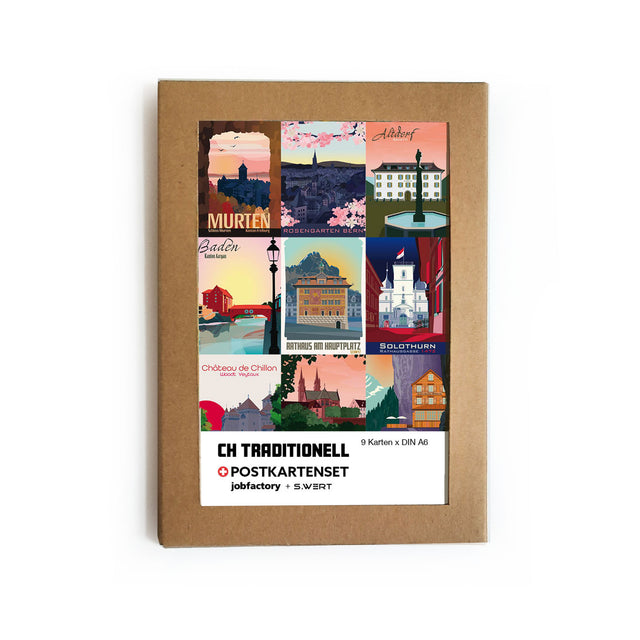 Postkartenset mit neun Illustrationen von traditionellen Schweizer Orten.