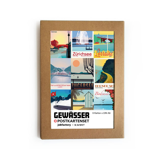 Postkartenset mit neun Illustrationen von Schweizer Gewässern.